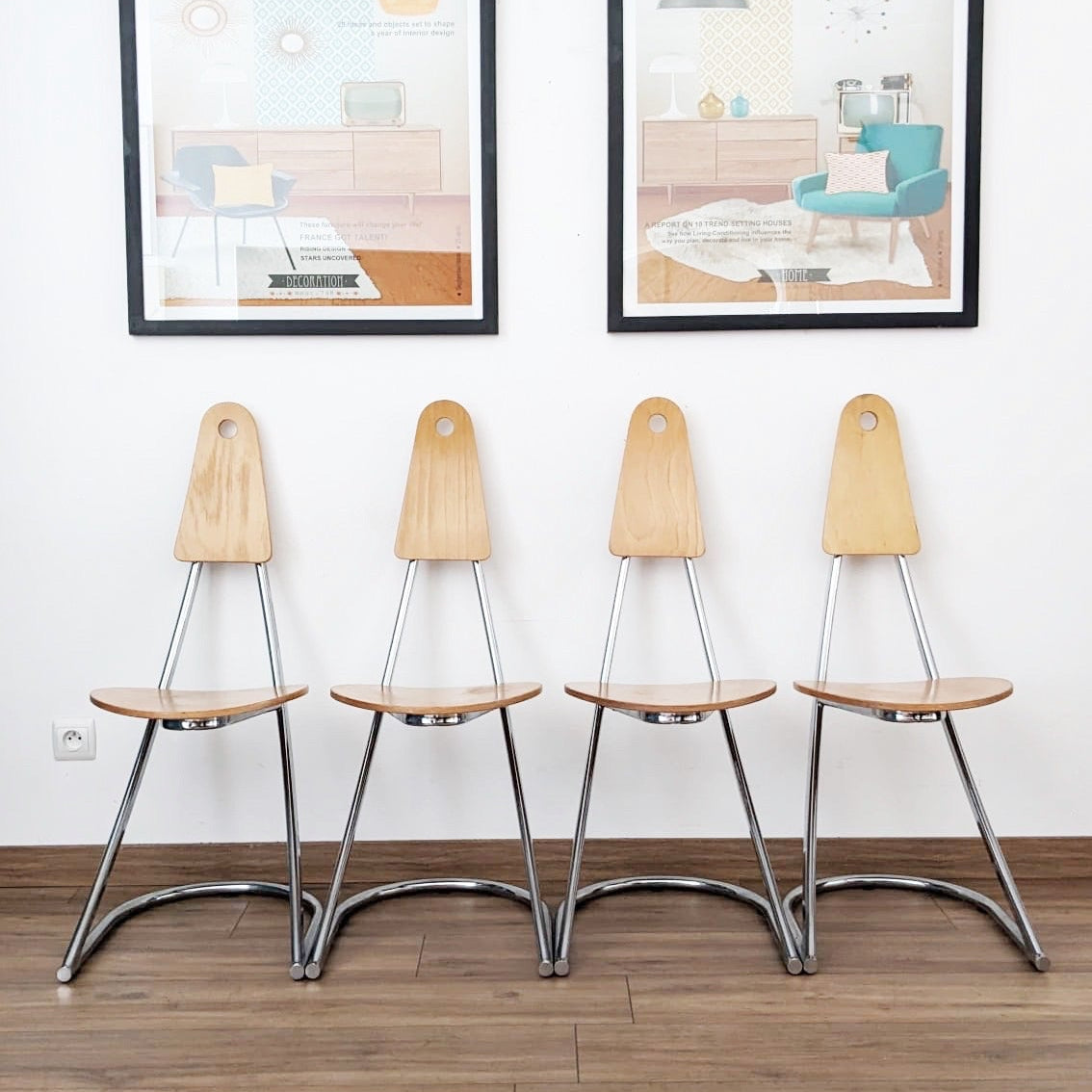 Ensemble table et 4 chaises MIRIMA collection Aria des années 80, châssis en métal chromé, assises, dossiers et plateau en bois teinté chêne clair.