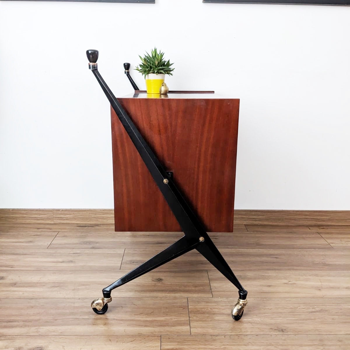 Meuble bar mid-century avec placage en bois chaud et lignes épurées. Façade avant battante donnant sur un bar intérieur miroir sophistiqué. Monté sur une structure métal et 4 roulettes.