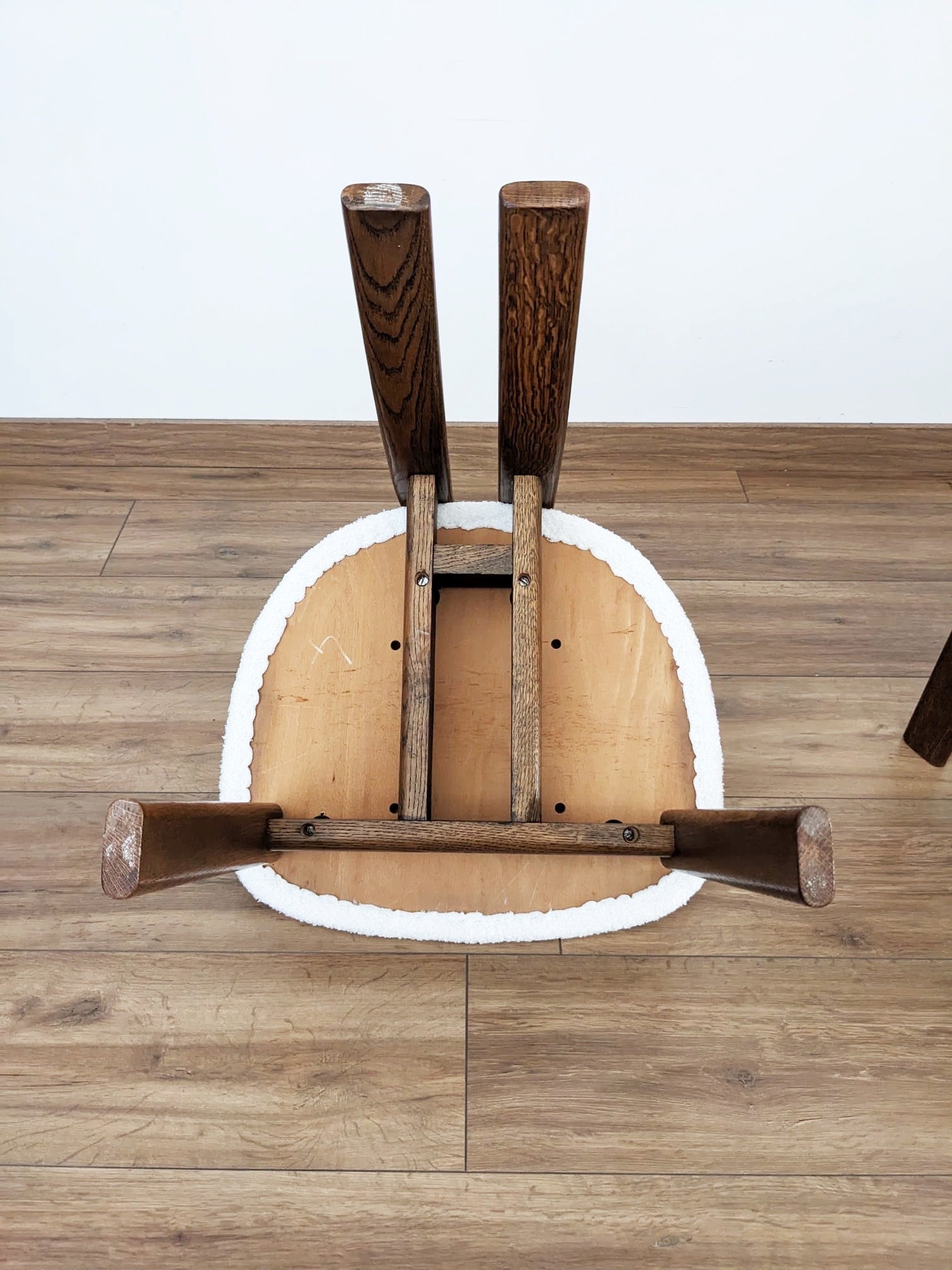 Ensemble de 6 chaises en T au design scandinave des années 50-60. La structure est en chêne massif, l'assise est restaurée entièrement et tapissée d'un tissu bouclette écru.