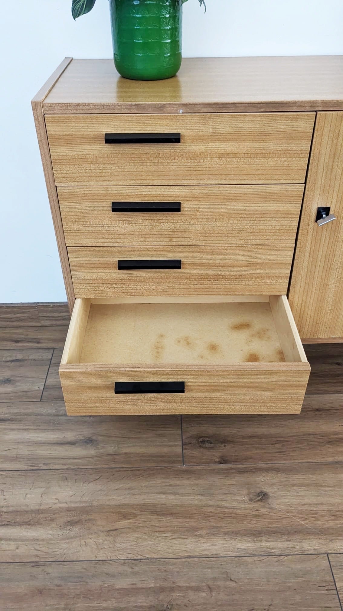 Petit meuble des années 60 en stratifié imitation bois de l'enseigne 3K Möbel avec 4 tiroirs et 1 porte battante donnant sur 1 compartiment avec étagère.