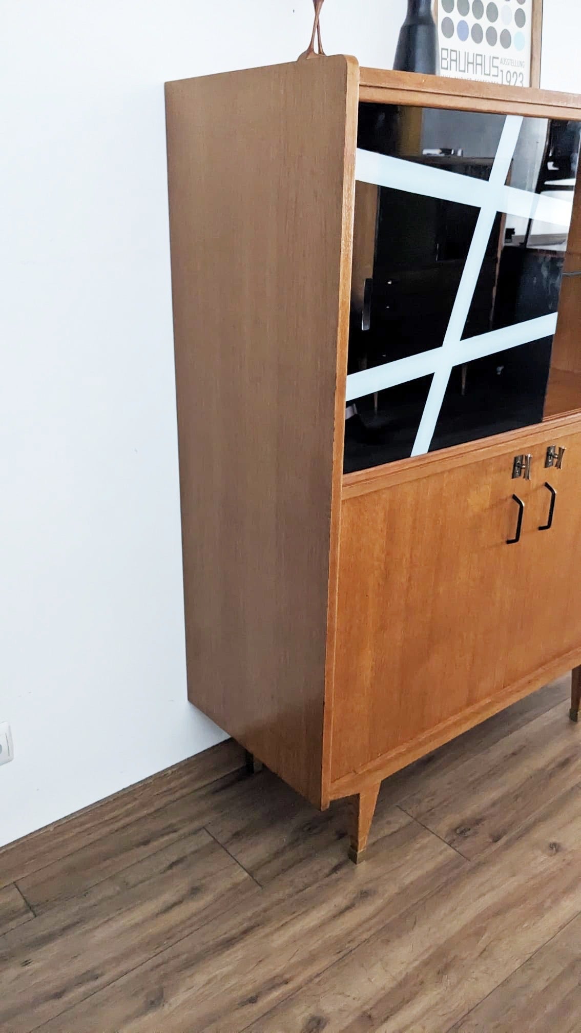 Meuble vitrine des années 60 composé de 2 portes battantes donnant sur 1 étagère et un compartiment vitré avec étagère.