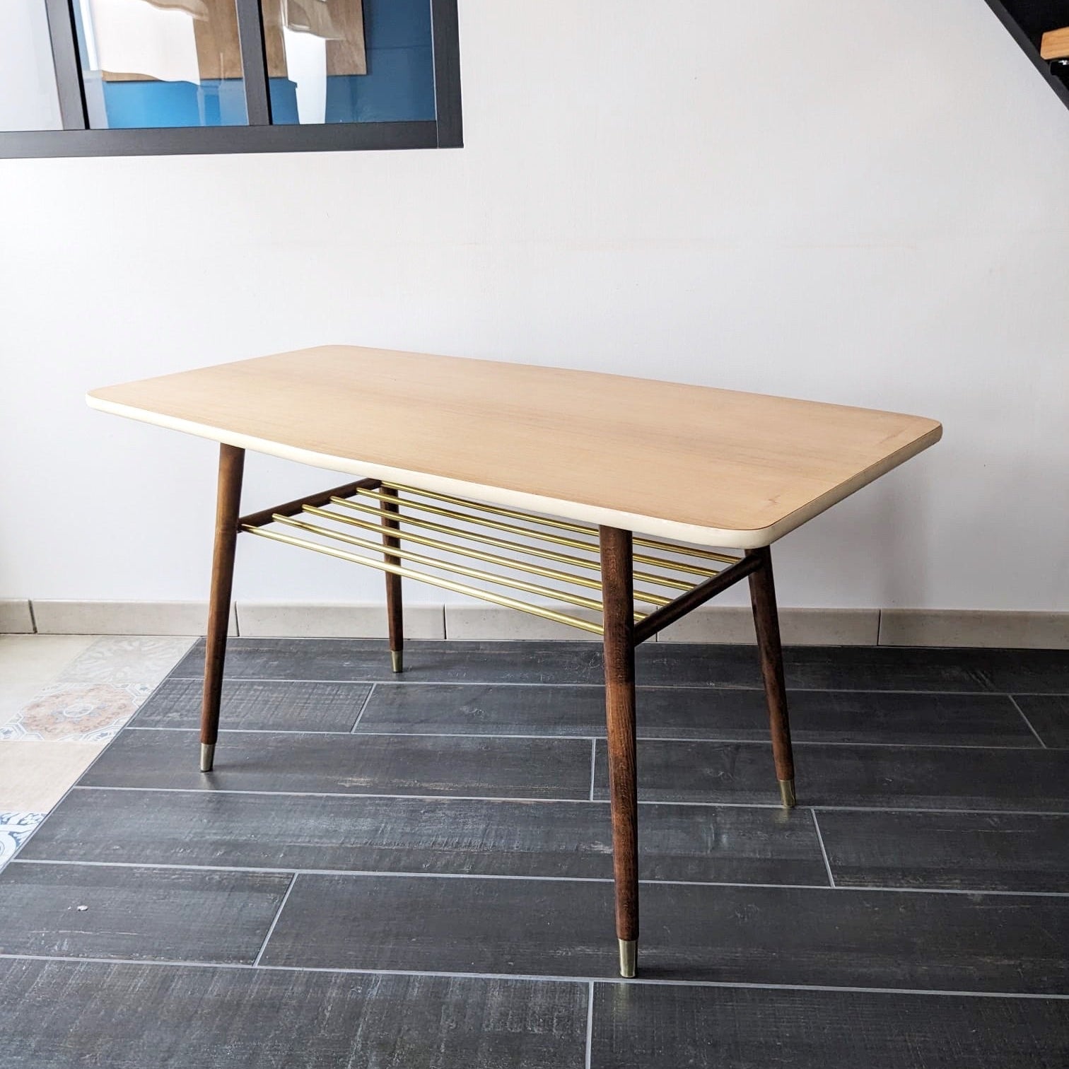 Table basse vintage des années 50 avec deux essences de bois, le plateau en hêtre orné d'un chant en caoutchouc beige, les pieds en chêne ornés d'une finition en laiton. Le porte revue est en métal doré.